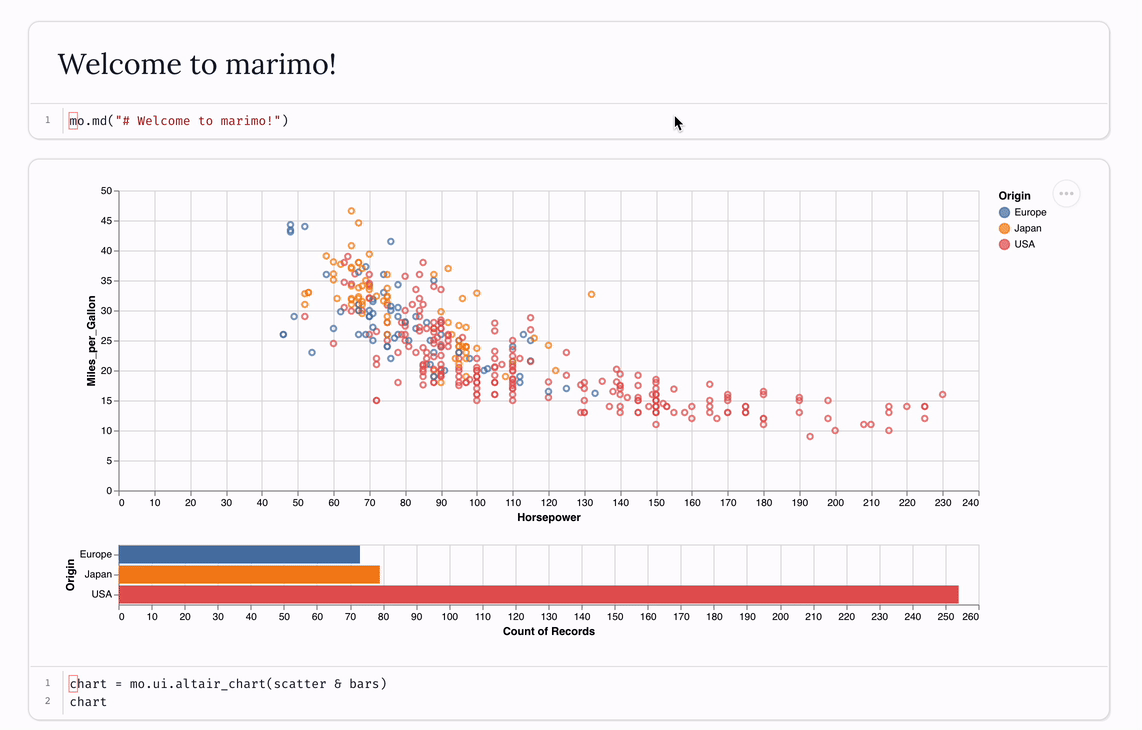 Altair is based on Vega-Lite, an exceptional tool for creating interactive charts that serves as the backbone for marimo’s reactive charting capabilities.